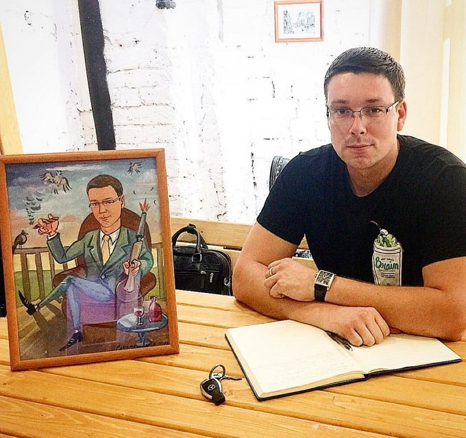 Андрей Чуев доволен портретом, который нарисовала для него поклонница.