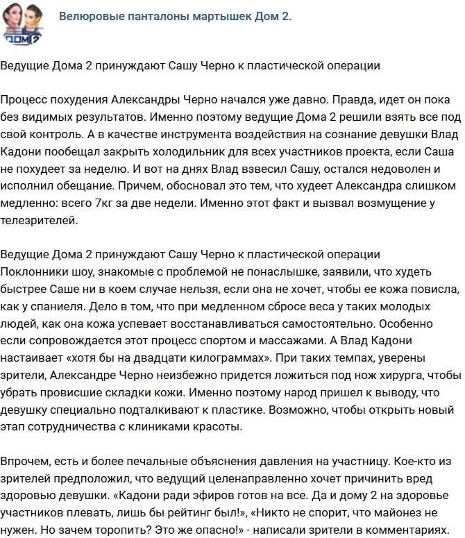 Руководство телестройки недовольно скоростью похудения Александры Черно.