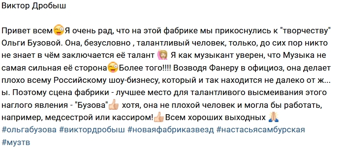 Виктор Дробыш: Бузова делает «плохо» всему шоу-бизнесу