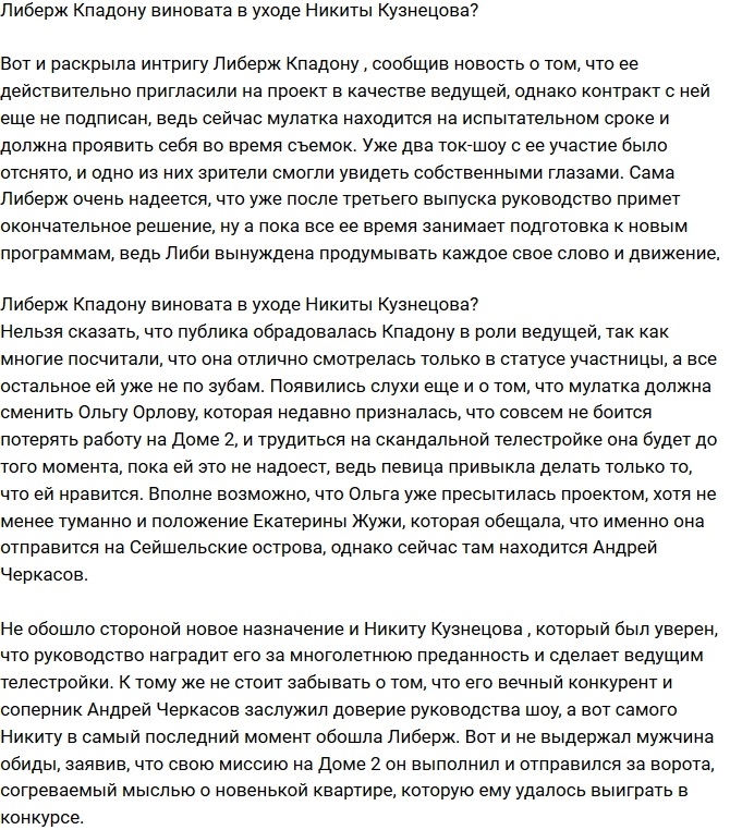 Телезрители полагают, что Никита Кузнецов покинул телестройку из-за того, что желанную должность ведущего отдали не ему, а Либерж Кпадону.