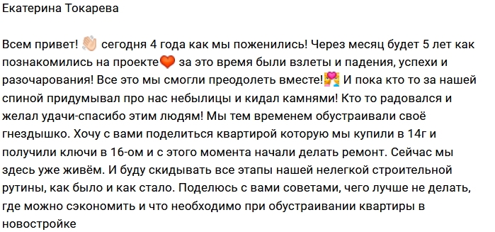 Экс-участница проекта Екатерина Токарева и её супруг Юрий Слободян наконец-то обзавелись своим жильём.