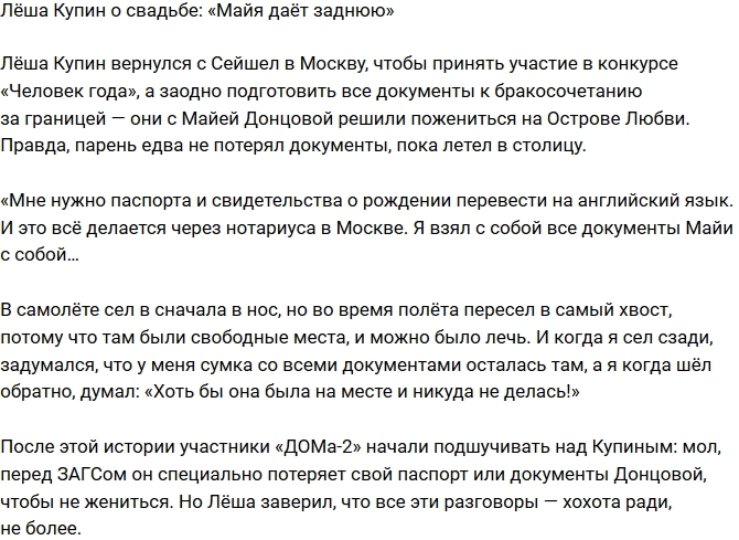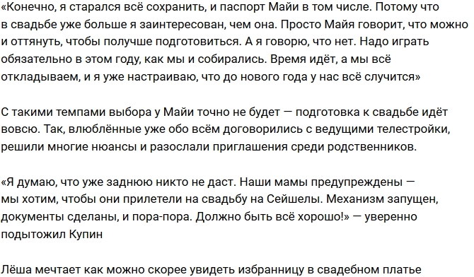 Алексей Купин посетовал, что Майя Донцова хочет оттянуть свадьбу.