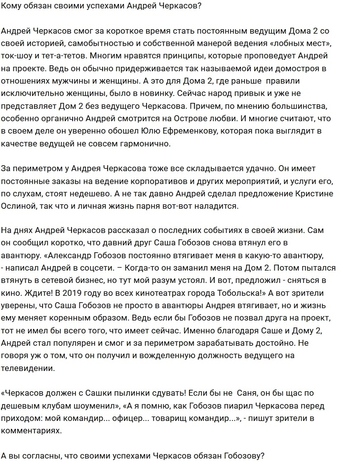 Некоторые фанаты телестройки считают, что Андрей Черкасов не стал бы ведущим проекта, если бы не его лучший друг Александр Гобозов.