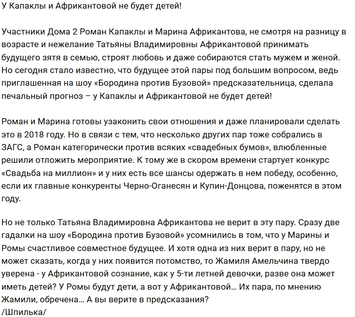 Поклонники Романа Капаклы и Марины Африкантовой обеспокоены словами экстрасенса о том, что у этой пары не будет детей.