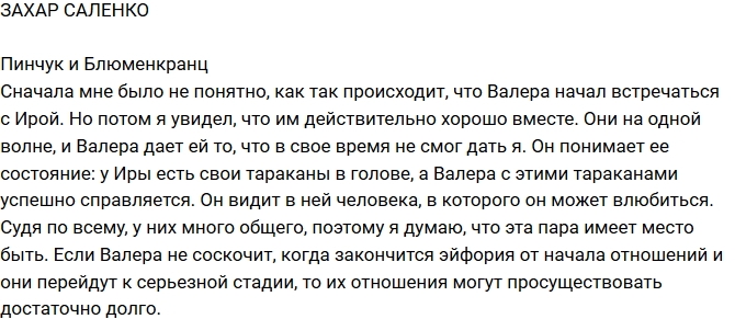 Захар Саленко прокомментировал отношения Ирины Пинчук и Валерия Блюменкранца.