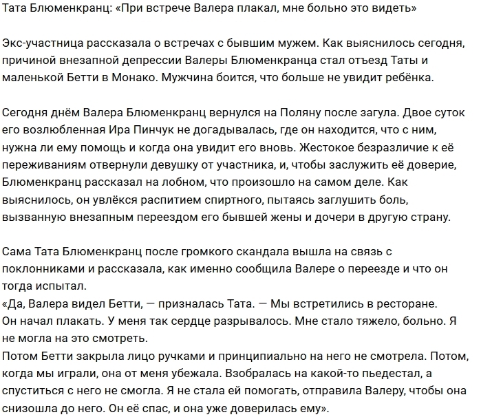 Тата Блюменкранц рассказала о своей встрече с бывшим мужем Валерием Блюменкранцем и причинах его депрессии.