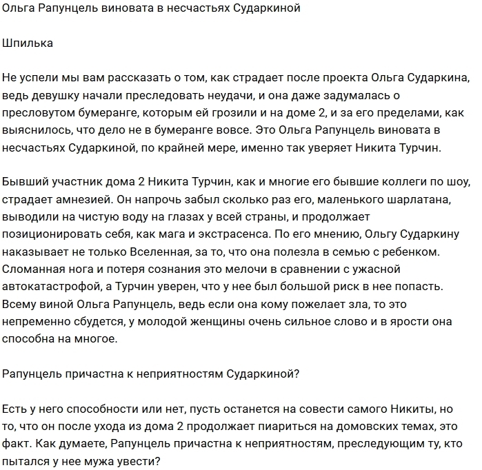 Бывший участник проекта Никита Турчин считает, что именно Ольга Рапунцель виновата во всех несчастьях, постигших Ольгу Сударкину.