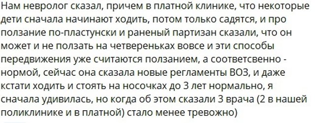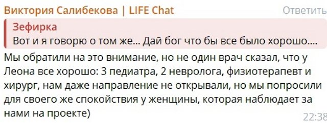 Телезрительницы на опыте обеспокоены и не могут понять, почему Леон почти в 9 месяцев не бегает на четвереньках, не встаёт на ножки, а ползает по-пластунски. Остался ли тонус, который, по словам Виктории, убрали массажами? Некоторые фолловеры Виктории убеждают её ходить с ребёнком в бассейн и на массаж к специалисту, предсказывая, что ребенок будет хромать, когда начнет ходить. Из-за этого Салибековы возили ребёнка по платным клиникам, но подписчиков успокоить не удалось.