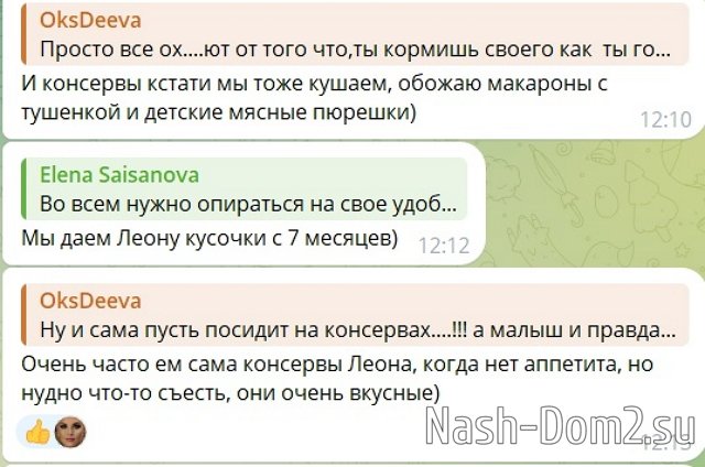 Виктория Салибекова развязала спор между подписчицами, которые доказывают друг другу, что лучше: делать грудным детям еду самостоятельно или давать готовое пюре. Виктория покупает прикорм в баночках и сама ест детские консервы, утверждая, что это вкусно и безопасно, некоторые подписчицы доказывают ей, что она должна готовить Леону пюре из фруктов и овощей сама, крутить в блендере, а не стоять у плиты, чтобы побаловать разными блюдами Тиграна.