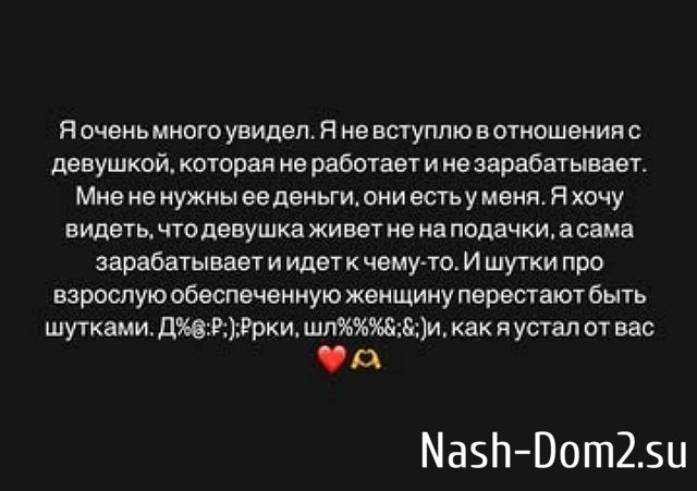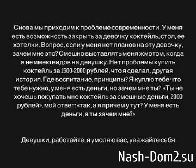 Вечный холостяк из Дома-2 гордится высокими доходами, но постоянно вспоминает свою экс-невесту Татьяну Строкову, которая живет на Бали с иностранцем. Вот Таня была девушкой достойной, могла за себя постоять, не выпрашивала коктейли и подарки, женщина взрослая и самодостаточная. А нынешние поклонницы Сахнова только и делают, что просят у него мелочь на расходы или цепляются в барах, чтобы получить бесплатную выпивку.