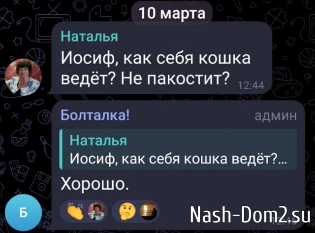 Зрители Дома-2 в очередной раз убедились в своей правоте по поводу невнимательного отношения Александры Черно к питомцам. Саша некоторое время назад хотела отдать кошку в хорошие руки, потому что животное метило территорию и испортило мебель в съемной квартире. Оказалось, что плохое поведение - месть животного. У Иосифа Оганесяна кошка ведёт себя лучше, чем у Саши Черно, хотя в квартире, где он арендует кровать, живет несколько детей и есть собаки.