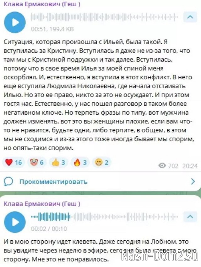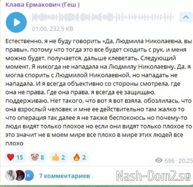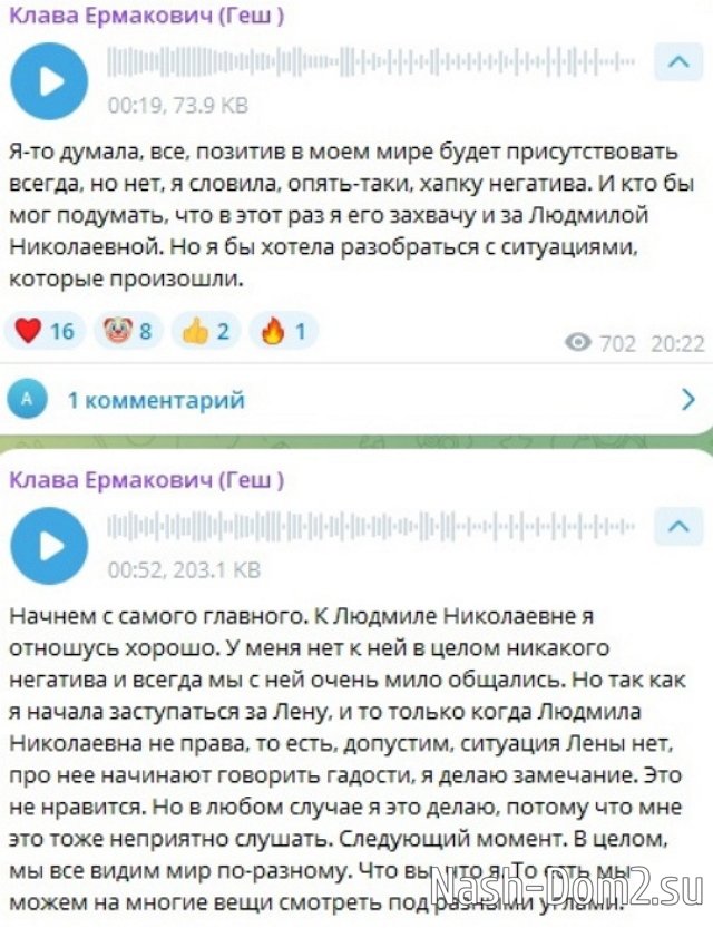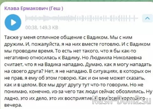 Подробности нового конфликта узнаем из эфиров 19.04.2025, Клава заметила, что телебабушка затаила на неё обиду и может иногда за спиной говорить плохо о других участницах Дома-2. В своё оправдание Безверхова записала несколько голосовых сообщений и уверена, что она права, а Людмила Николаевна зря упрекает её дружбой с Вадимом. С этим Клава и Вадим разберутся сами.