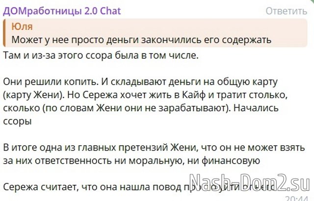 Ведущая телепроекта в Сочи сообщила телезрителям о причине ухода с телестройки Евгении Дорожкиной, которая забрала вещи с Поляны, а из Адлера ей будут высылать оставшиеся чемоданы. Оказалось, что Евгения Дорожкина сбежала из Дома-2, отказавшись содержать Хорошева - они собирали на карту деньги, а Сергей решил шиковать и забыл, что пришло время экономить.