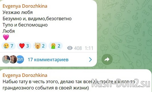 Дорожкина сама решила участвовать в конкурсе "Медовый месяц", из-за неё убрали пару Элины Рахимовой и Никиты Гуранды. Хорошев сделал предложение, купил кольцо, Дорожкина казалась счастливой и пару Игоря Григорьева упрекала в неискренности. И вот такой конец романтической истории?