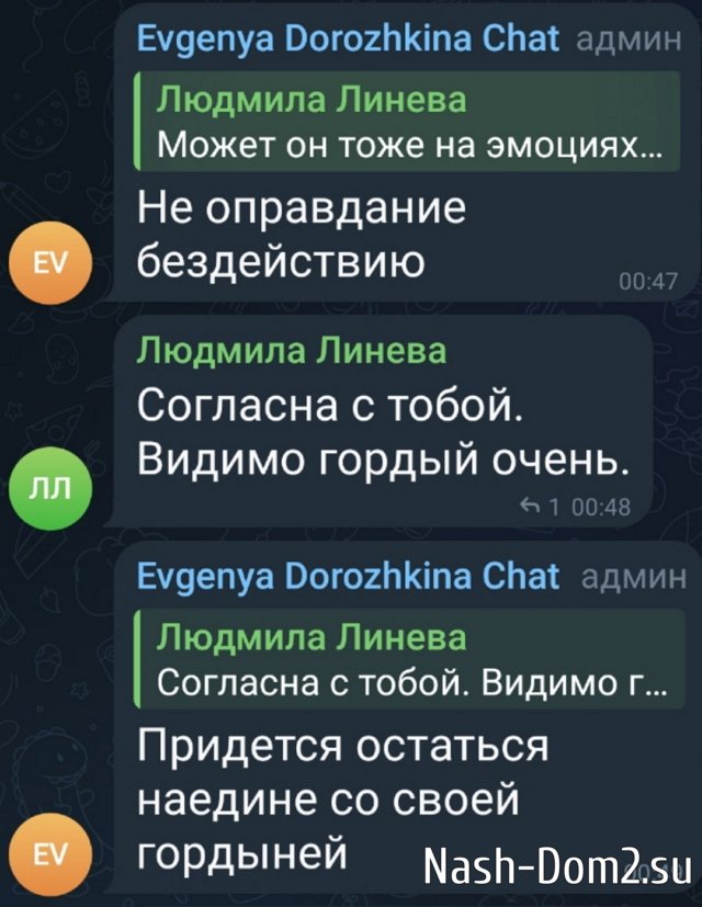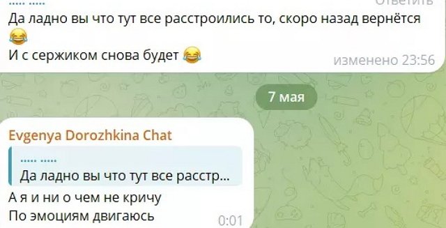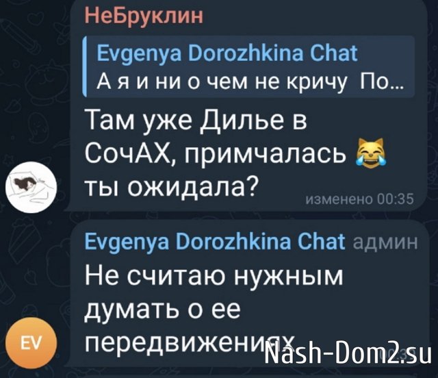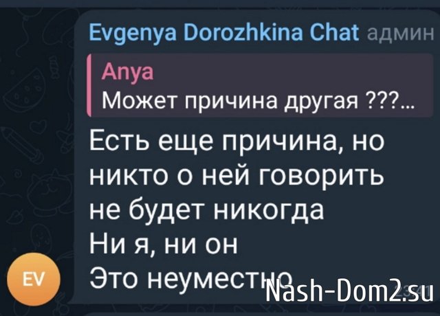 Женя Дорожкина продолжает обсуждать с подписчиками своё расставание с участником Дома-2 Сергеем Хорошевым, которого она убеждала, что нужно уйти с проекта вместе, а он заявил о своих интересах и остался в Сочи. Дорожкина не исключает, что помирится с Сергеем Хорошевым, всплыла новая история с очередной причиной расставания - секретной, которую неэтично обсуждать в чатах.