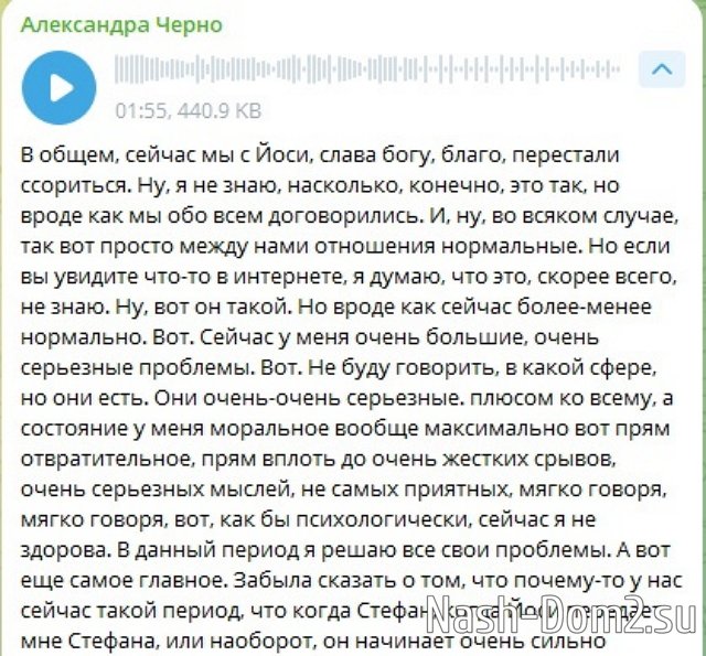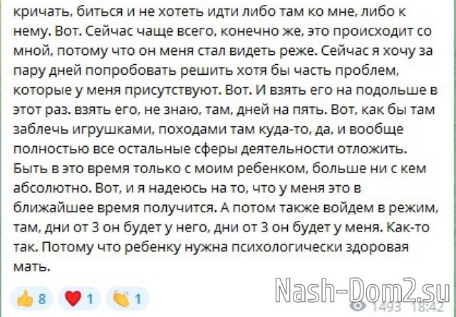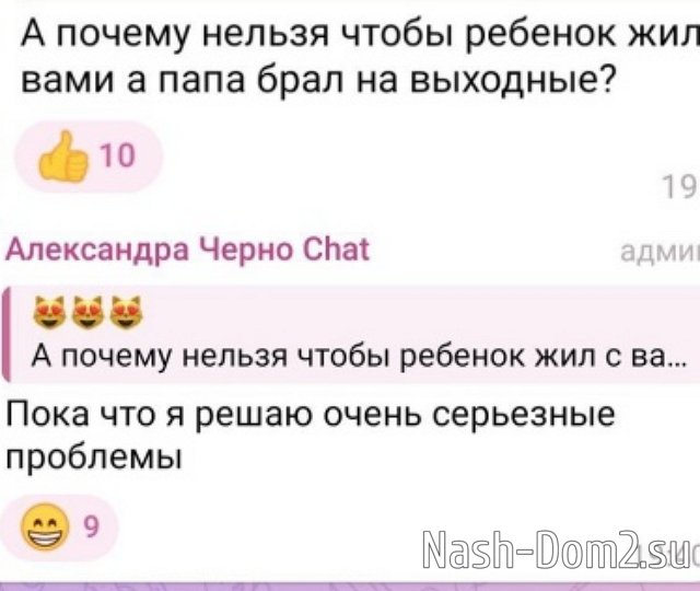 У Черно бывают жесткие срывы, ребенок перестает слушаться, моральное состояние у звезды Дома-2 отвратительное, о чем на сообщила в голосовом сообщении. В чем проблема, Саша не рассказывает, но подчеркнула, что дела очень срочные, она возьмет к себе Стефана на 5 дней, когда справится с неприятностями и возьмет себя в руки.