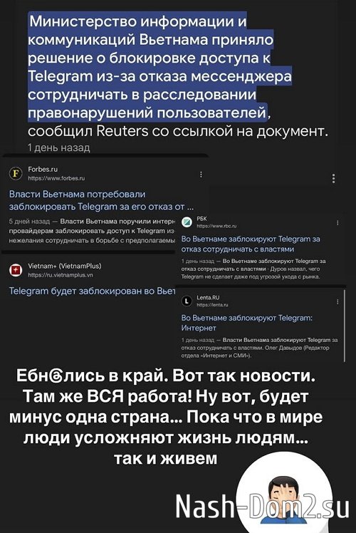 Бывший участник телепроекта Евгений Ромашов возмущен тем, что власти Вьетнама заблокировали Телеграм. На популярной в России платформе у Ромашова много рабочих видео и контента, сотрудничество и контакты, поэтому он ищет выход из ситуации.