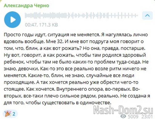 Саша призналась в очередной раз, что ей сложно быть одной, ей нужен хороший мужчина рядом, тогда она изменится и займется заботой о домочадцах. Но пока получается только сводить знакомых одиноких девушек и парней, что слегка расстраивает звезду Дома-2. Сваха Александра Черно мечтает о новой семье и классном ребенке, но пока контингент парней, что за ней ухаживают, её не устраивает. А если верить Оганесяну, то первого ребёнка она берет к себе два раза в месяц. Значит, так и живет одна-одинёшенька.