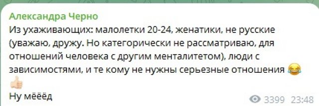 Черно описала в одном посте всех своих ухажеров, отметив главные причины своего отказа - или менталитет мужчины её не устраивает, или возраст, или намерения и образ жизни. Пока что "Фениксу" не повезло найти то самое.