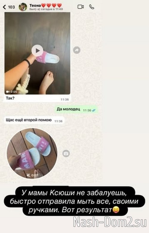 Ксения Бородина переняла манеру воспитания детей у своей мамы. Она рассказала, как Теона испачкала пляжные тапочки, после чего Ксения купила новые, но дочка их носить не захотела. В итоге Теоне пришлось отмывать старые тапки, с чем она успешно справилась.