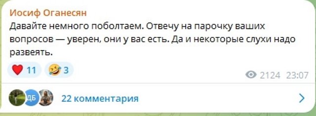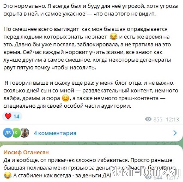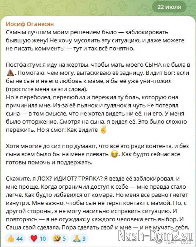 Иосиф Оганесян пообщался с подписчиками и обсудил с ними свою бывшую жену Александру Черно.
