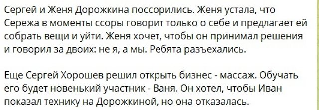 Объединившись с новичком Иваном, Хорошев начал учиться массажу, но Дорожкина отказалась ему помогать в бизнесе, предчувствуя, что ей придется вкладываться в эту затею. Забирает ли Женя по-прежнему все деньги у Сергея, пока неизвестно.