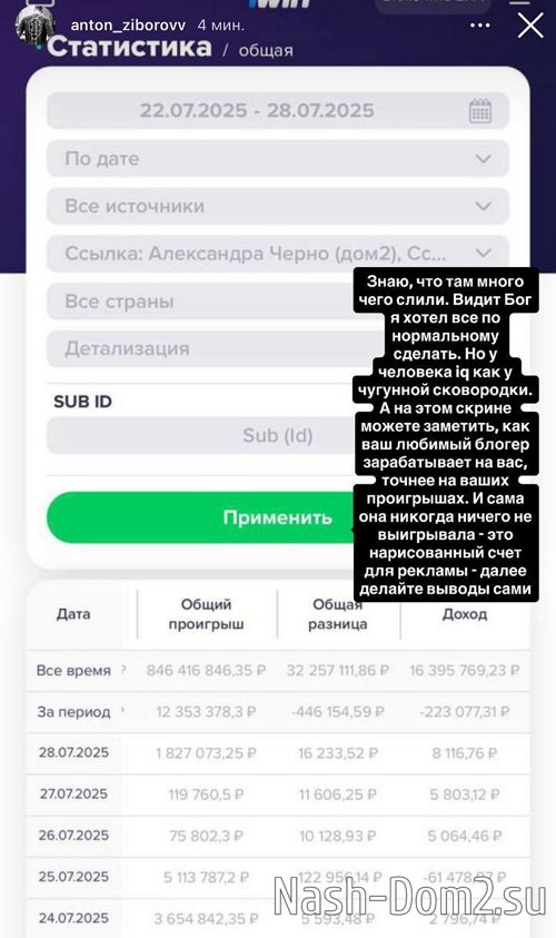 Блогерша была возмущена тем, что скрин статистики по проигрышам за неделю, который она отправляла одному адресату, Зиборов опубликовал и вызвал новую волну хейта в её адрес. Но парень также отметил, что она ничего не выигрывает, хотя показывает часто поступления на карту - это картинка для привлечения новых игроков.