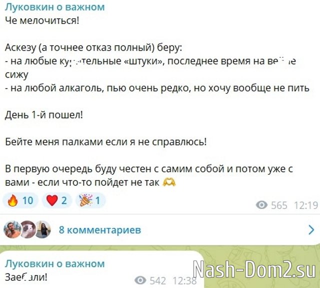 Луковкин часто говорил про спорт, здоровый образ жизни и путешествия, а на деле - в оковах пороков. Поэтому заявил в своём блоге, что берет аскезу, в первую очередь, от потери времени на сайтах знакомств. А потом и от других зависимостей решил избавиться. И тут ему дамы, которые подписались, чтобы наблюдать за парой Димы и Настей Филипповой, начали говорить, что аскеза у него от отношений. Дима отправил одну из таких подписчиц лесом и поймал такой кураж, что начал незнакомой женщине претензии предъявлять.
