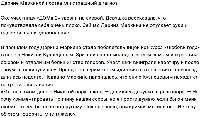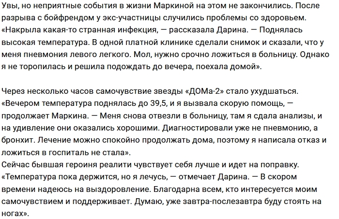 Экс-участница проекта Дарина Маркина рассказала о своей болезни журналу телестройки.