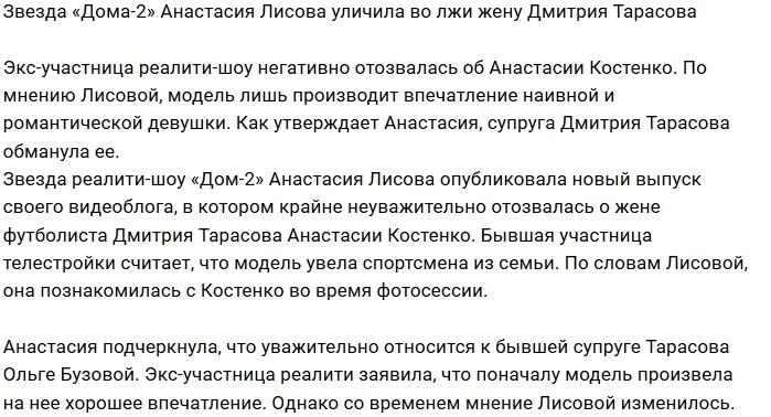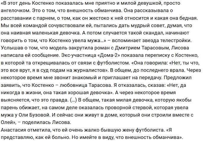 Анастасия Лисова поведала о том, как в своё время её ввела в заблуждение Анастасия Костенко, которая теперь является женой Дмитрия Тарасова.