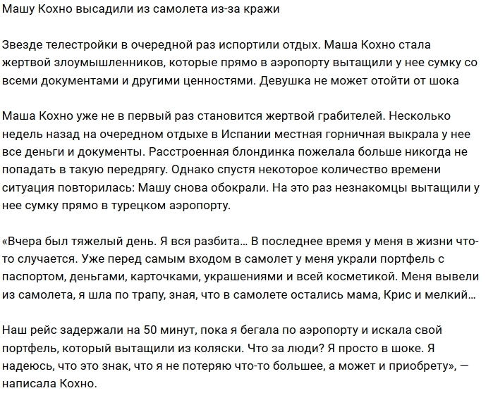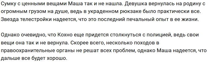 Экс-участница проекта Мария Кохно попала в неприятную ситуацию в турецком аэропорту из-за кражи сумки, в которой были все её документы.