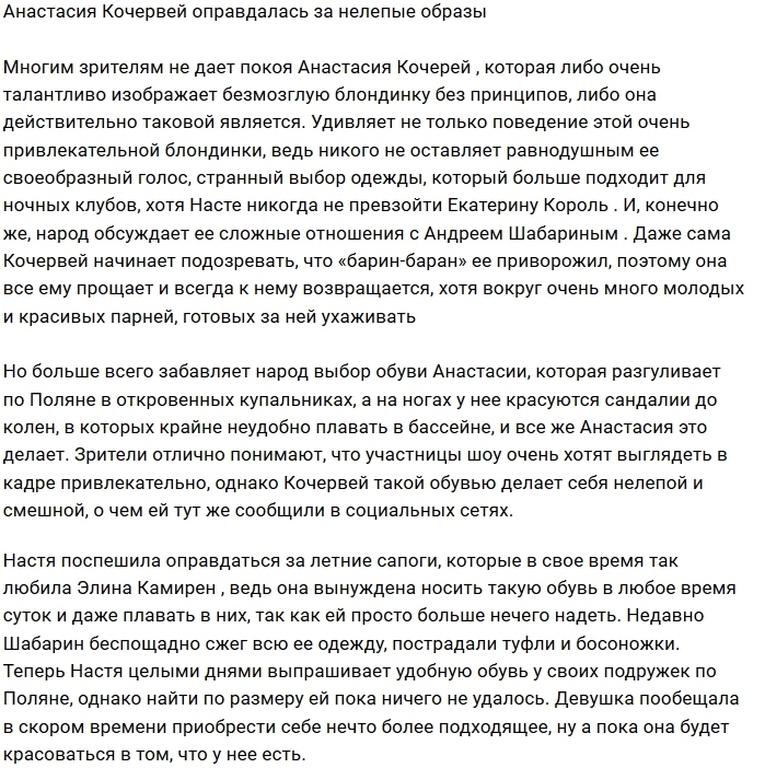 Анастасия Кочервей стала объектом многочисленных шуток и комментариев поклонников проекта из-за своих нелепых образов.