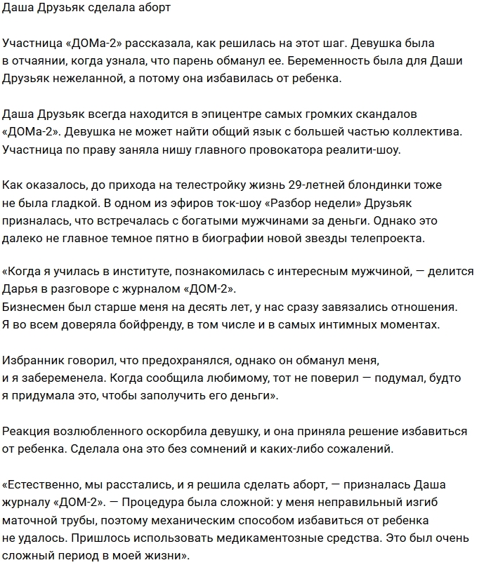 Дарья Друзьяк избавилась от нежеланного ребёнка