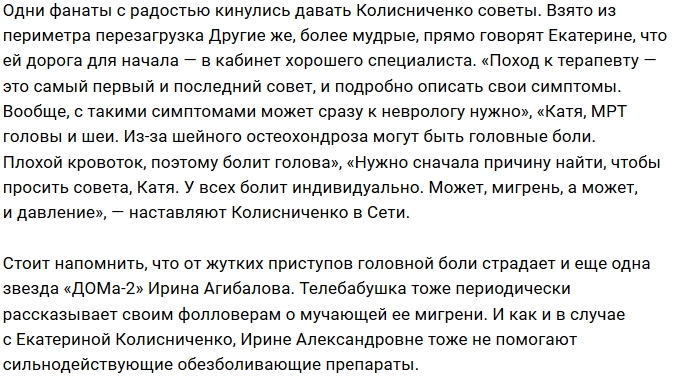 Екатерина Колисниченко призналась своим поклонникам в том, что она страдает мучительными мигренями.