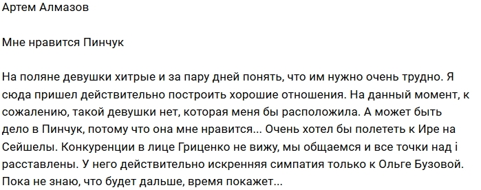 Артем Алмазов утверждает, что ему нравится Ирина Пинчук, ради которой он даже готов лететь на Сейшелы.