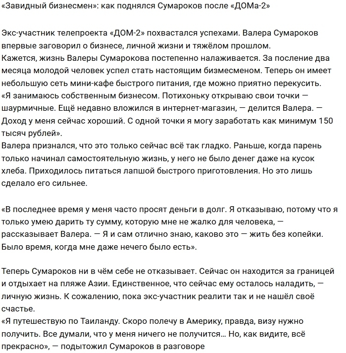 Покинув телепроект, Валерий Сумароков занялся бизнесом и отправился в путешествие.