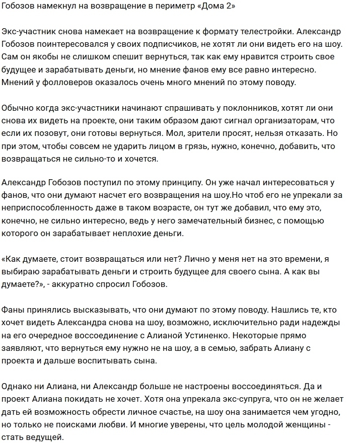Александр Гобозов признался своим подписчикам, что опять подумывает об очередном возвращении на телестройку.