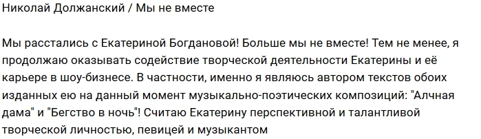 Николай Должанский сообщил о своём расставании с Екатериной Богдановой.