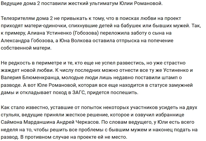 Ведущие телестройки дали Юлии Романовой неделю, для того чтобы она подала на развод с мужем.